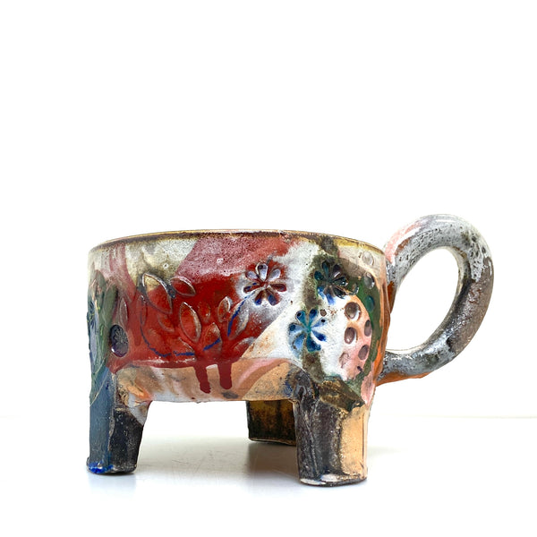 This is a soda fired earthenware mug. There is a stamped and stained exterior surface. And it sits on 4 pedestal feet. It has a porcelain slip and underglazes on the exterior.