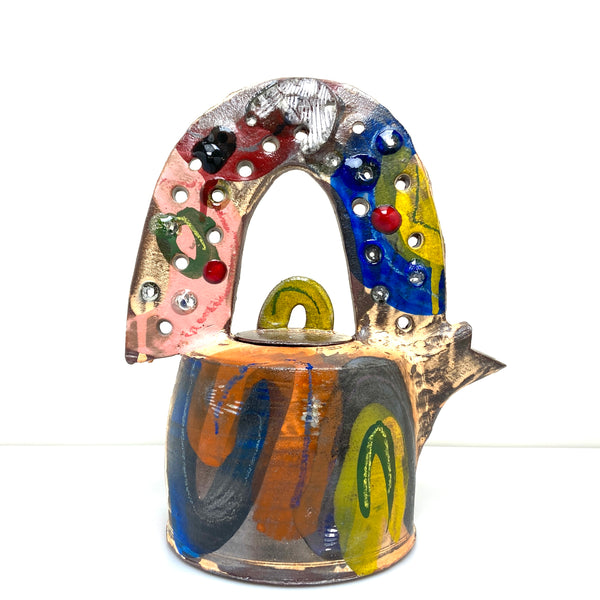 This is a soda fired earthenware teapot with a rainbow shaped handle. It has a porcelain slip and underglaze decorations.