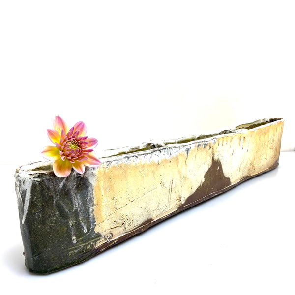 This is a soda fired earthenware flower holder. It has a porcelain slip poured over the surface