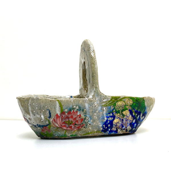 This is a soda fired earthenware tray with a rainbow shaped handle. It has a porcelain slip on the exterior. Perfect for pistachios, or other snacking needs.